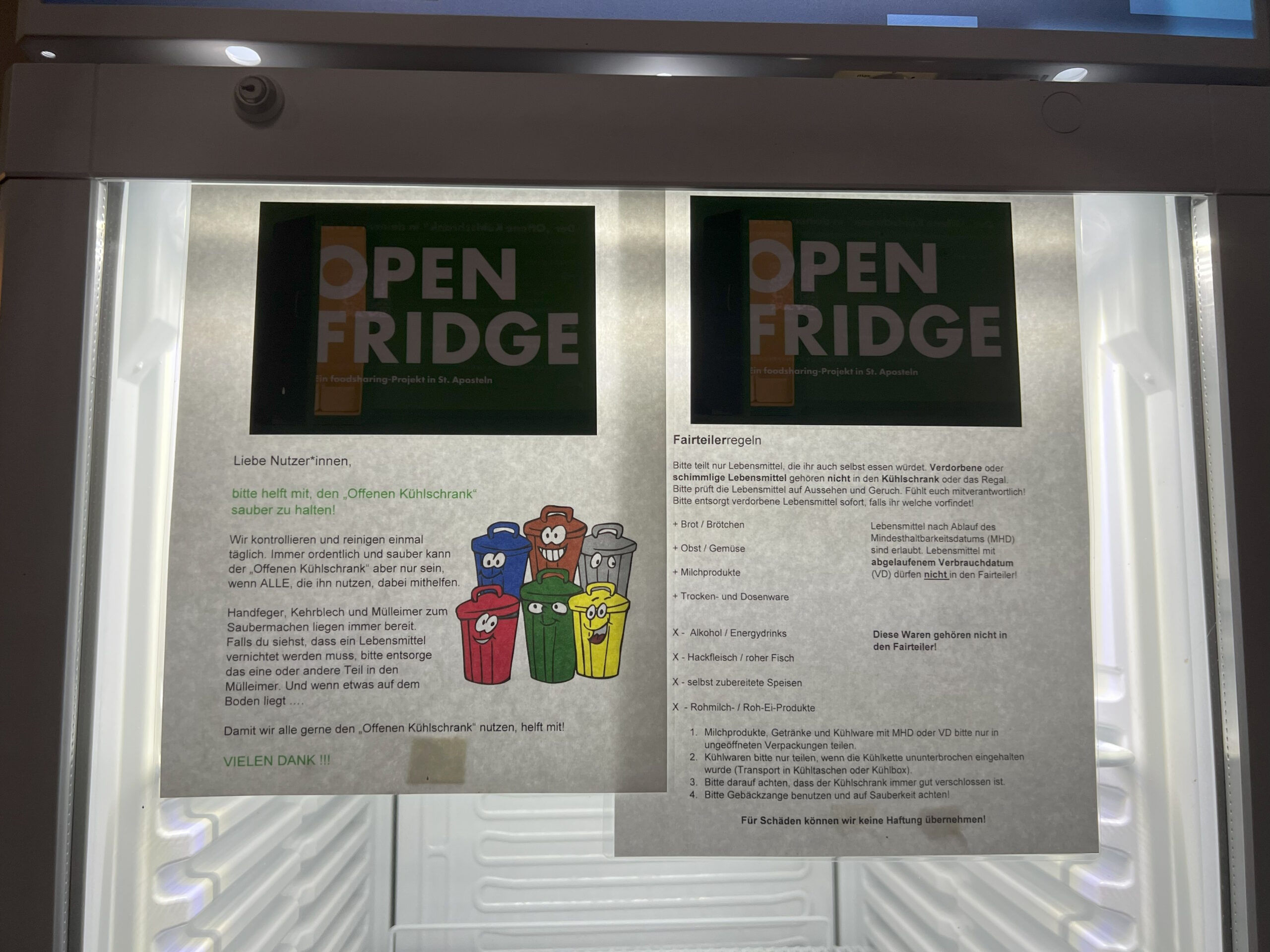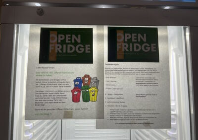 Ein weiteres tolles Projekt ist der sogenannte „Open Fridge“. In den Kühlschrank kann jeder, der etwas übrighat, Lebensmittel ablegen, die dann von anderen entnommen werden können. Mit dem gleichen Prinzip stehen dort Schränke, in den man Alltagsgegenstände legen kann, die nicht mehr gebraucht werden, die dann von anderen genutzt werden können. Dieser Austausch fördert nicht nur die Solidarität, sondern auch die Idee der Resteverwertung.