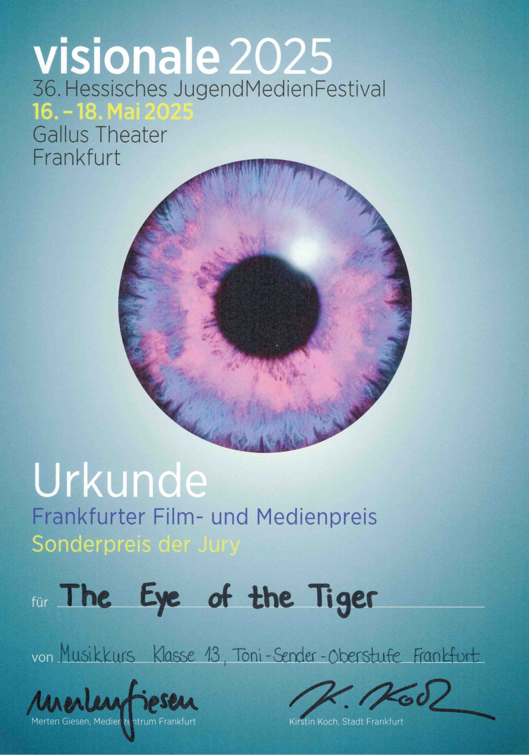Mit zwei aus Unterrichtsprojekten hervorgegangenen Filmen beteiligte sich die TSO an der 36. Visionale 2025 im Gallustheater. Der Film „Wir machen Musik in Musik – The Eye of the Tiger“ des 13er Musikkurses gewann dabei den Sonderpreis der Jury.