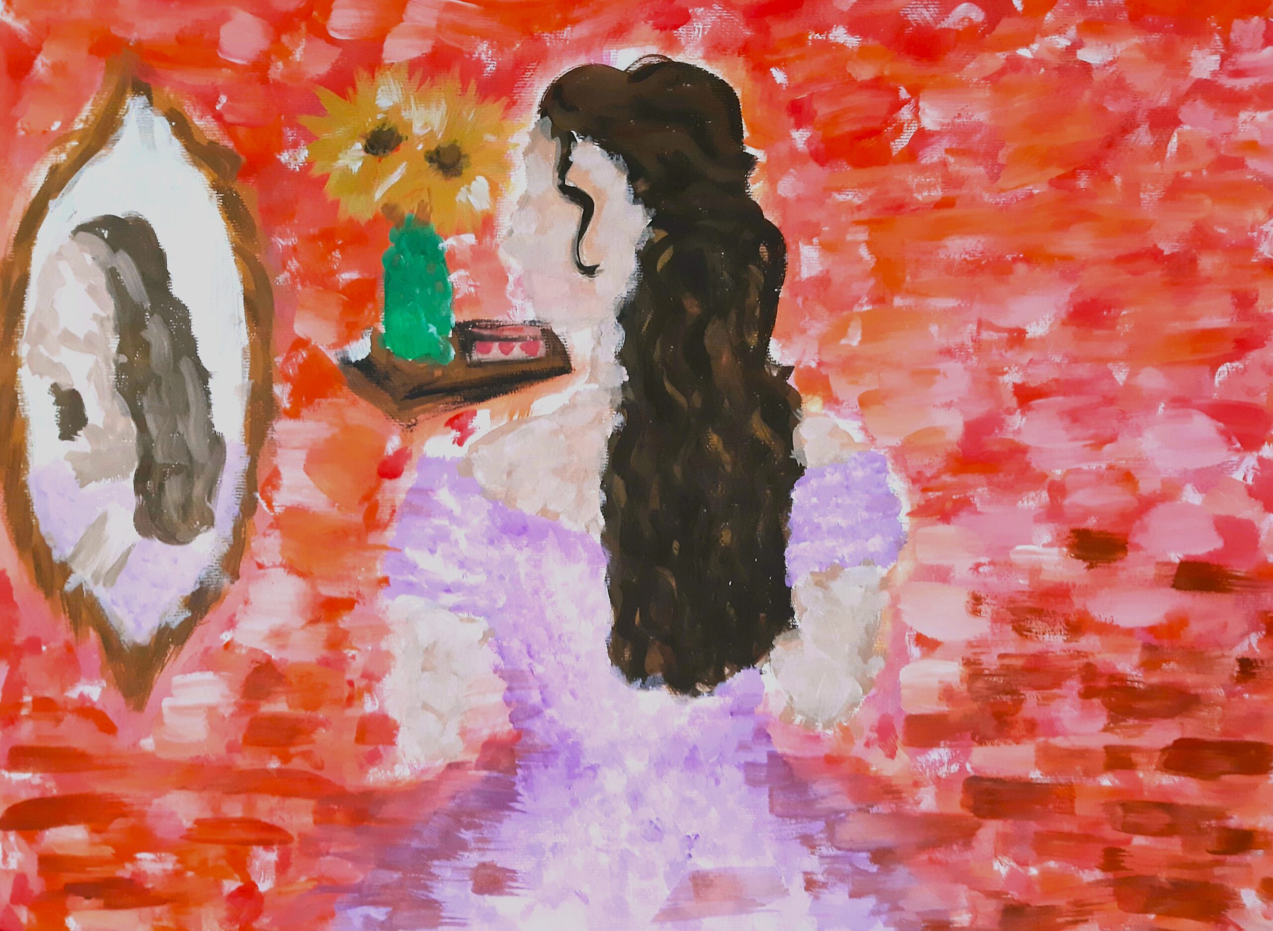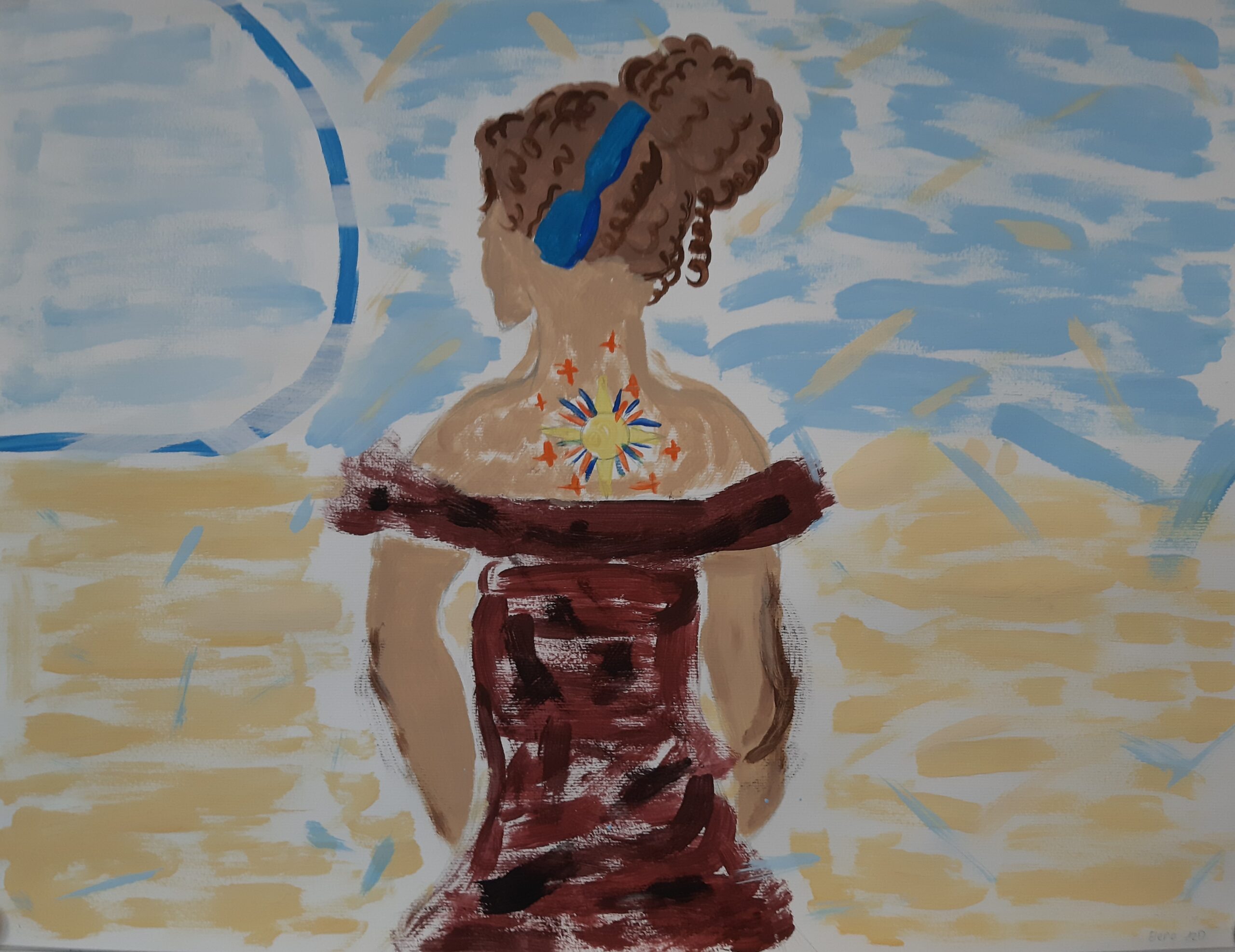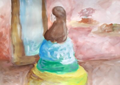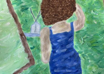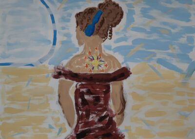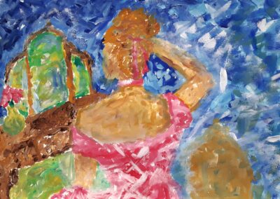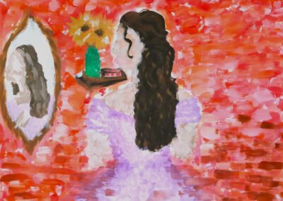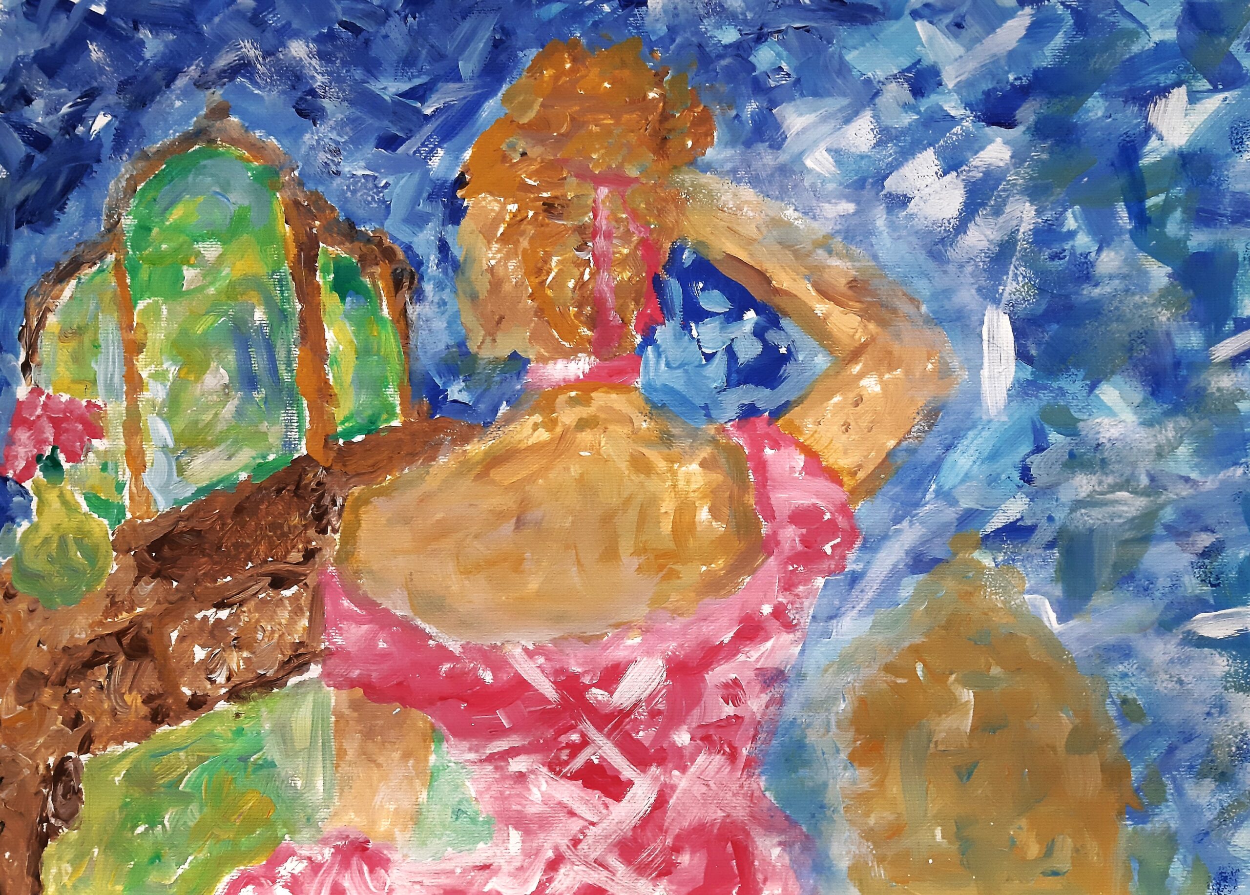 - die Gestaltungskriterien des Impressionismus verwenden (sichtbarer Pinselduktus, angeschnittenes Motiv, kein Schwarz, keine Farbperspektive, Papieruntergrund darf an manchen Stellen sichtbar sein …, auch Figur in der Bildmitte positionieren)