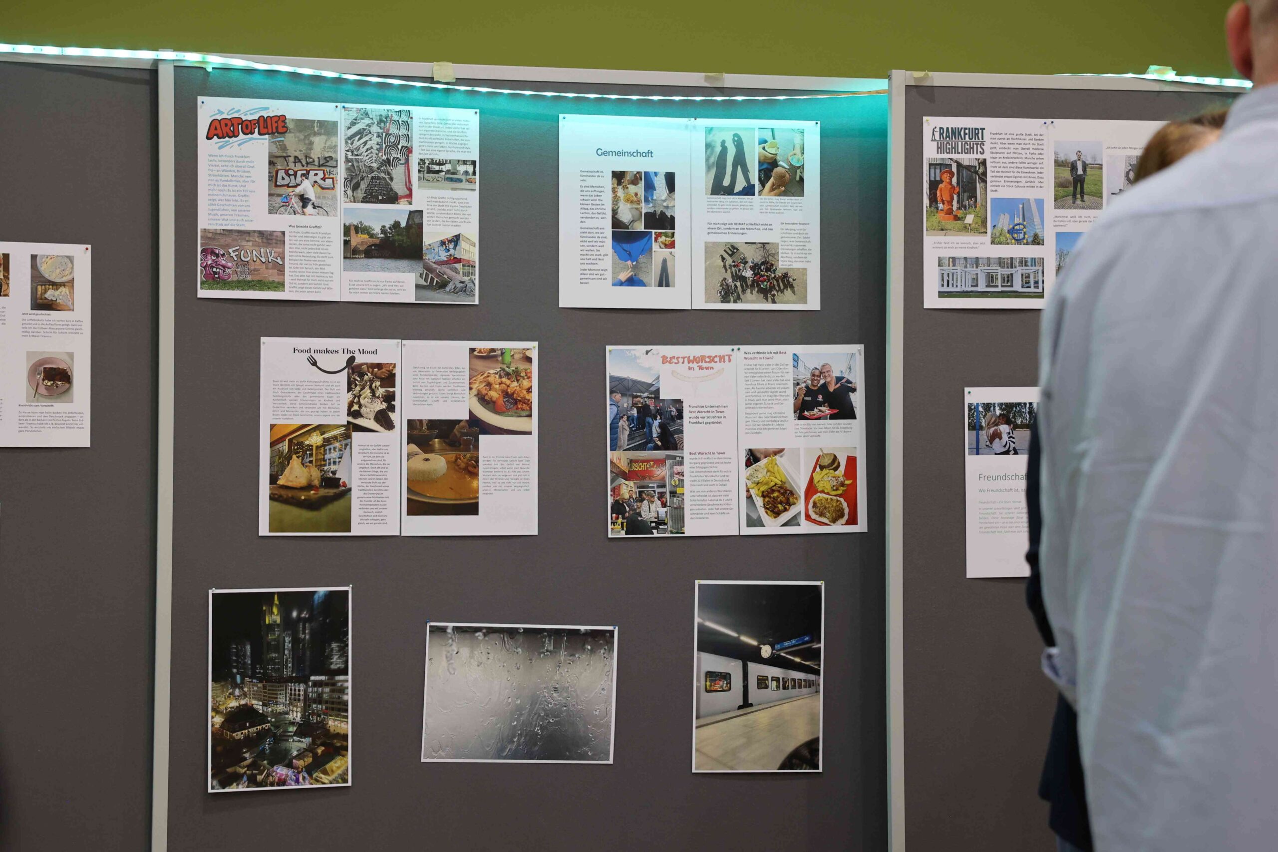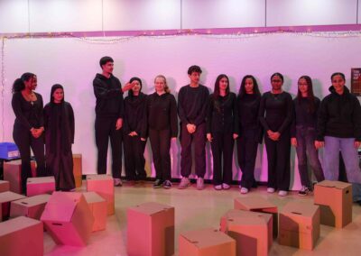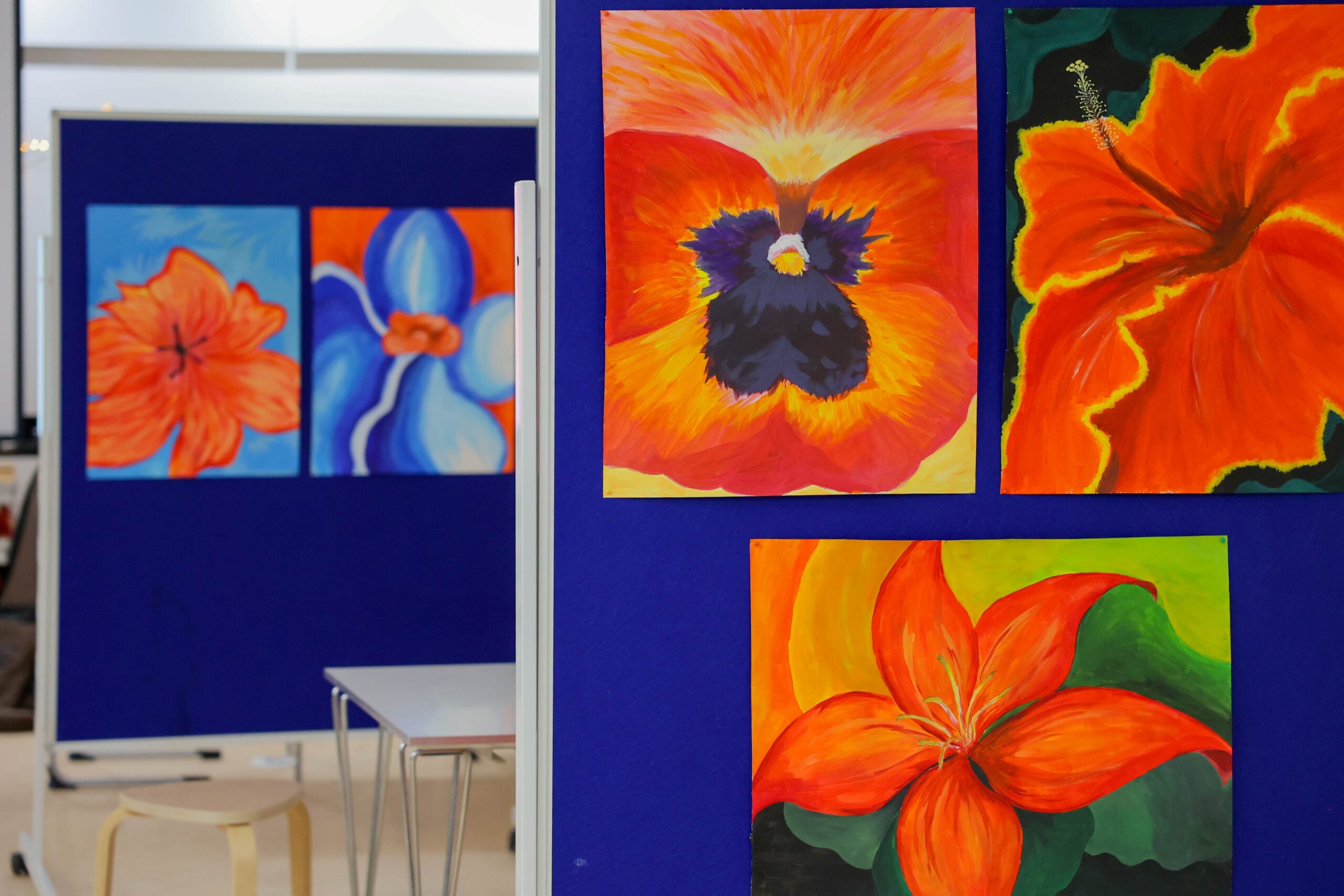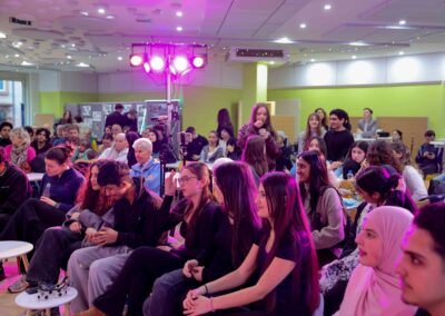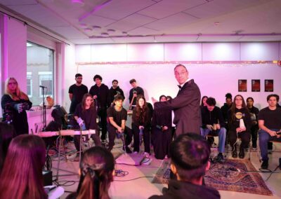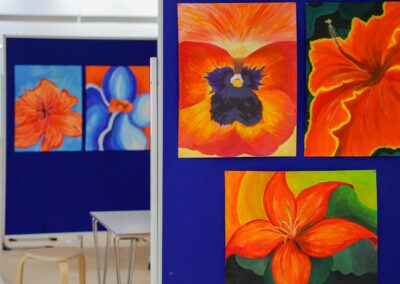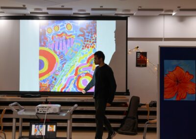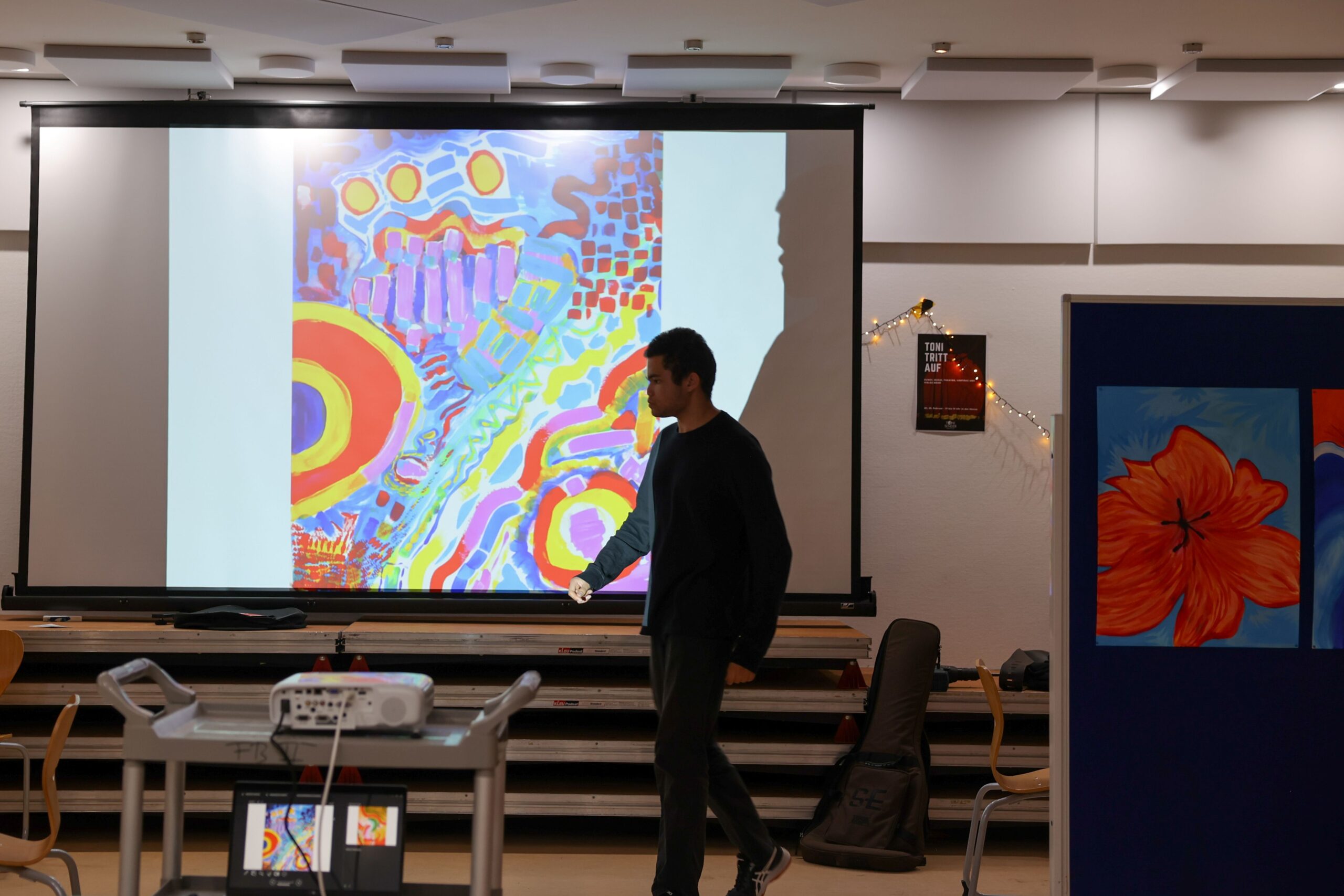 Eingerahmt wurde das Bühnenprogramm von beeindruckenden Kunstausstellungen im Foyer und in der Mensa. Die Kunst-Kurse von Silvia Adams und Carola Ströter präsentierten Werke wie „Der sinnliche Blick auf die Blüte“, „Come together into the new year 2026“ sowie das Projekt „HeimaRt“ aus dem Jahr 2025. Eine großformatige Videoinstallation per Beamer setzte die Bilder aus dem Kunstkurs von Carola Ströter zusätzlich großformatig in Szene. Ein herzlicher Dank geht hierbei auch an Martin Oyntzen (13c) und Olivia Krajewska (13d) für die inhaltliche Begleitung der Ausstellung.