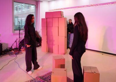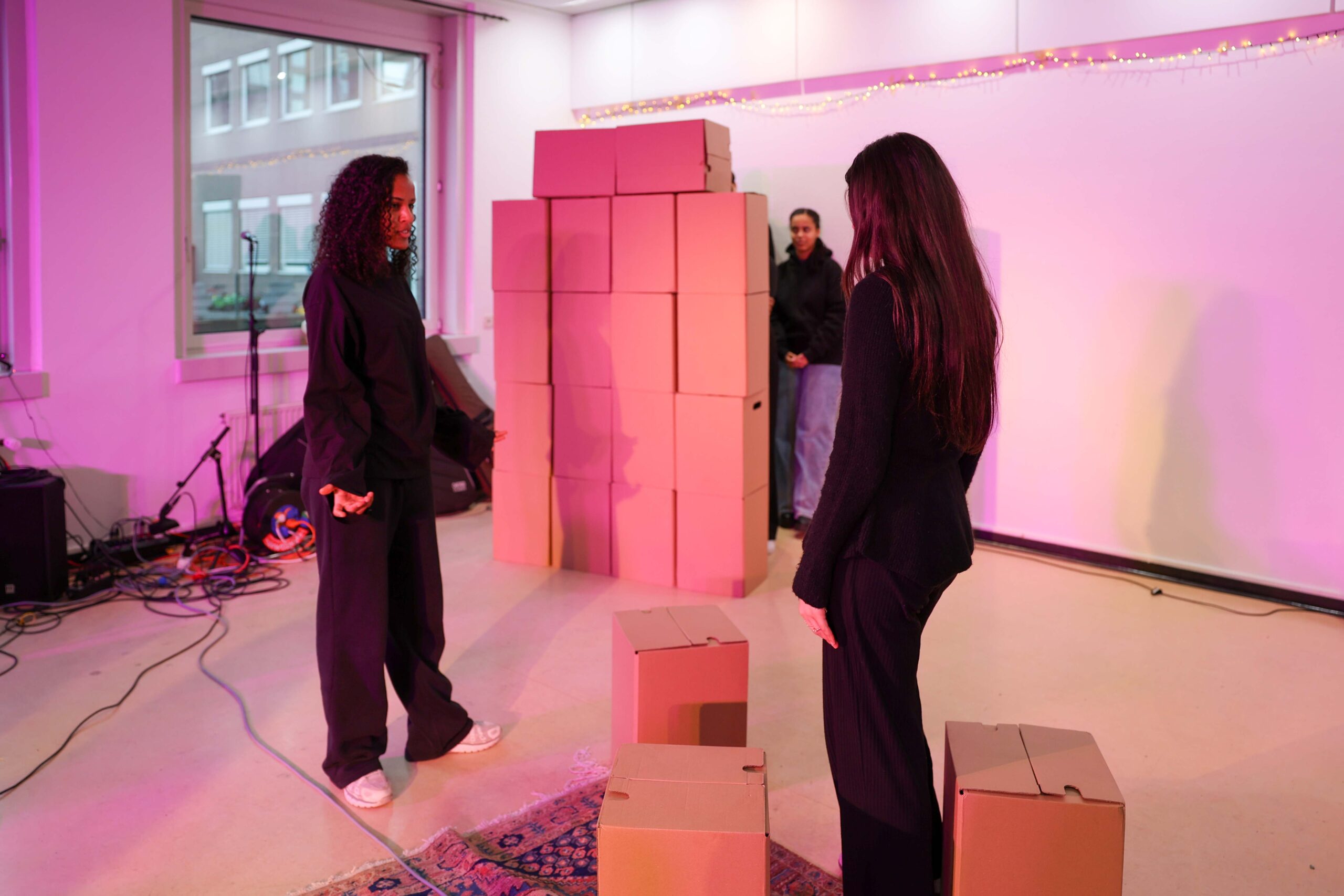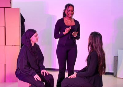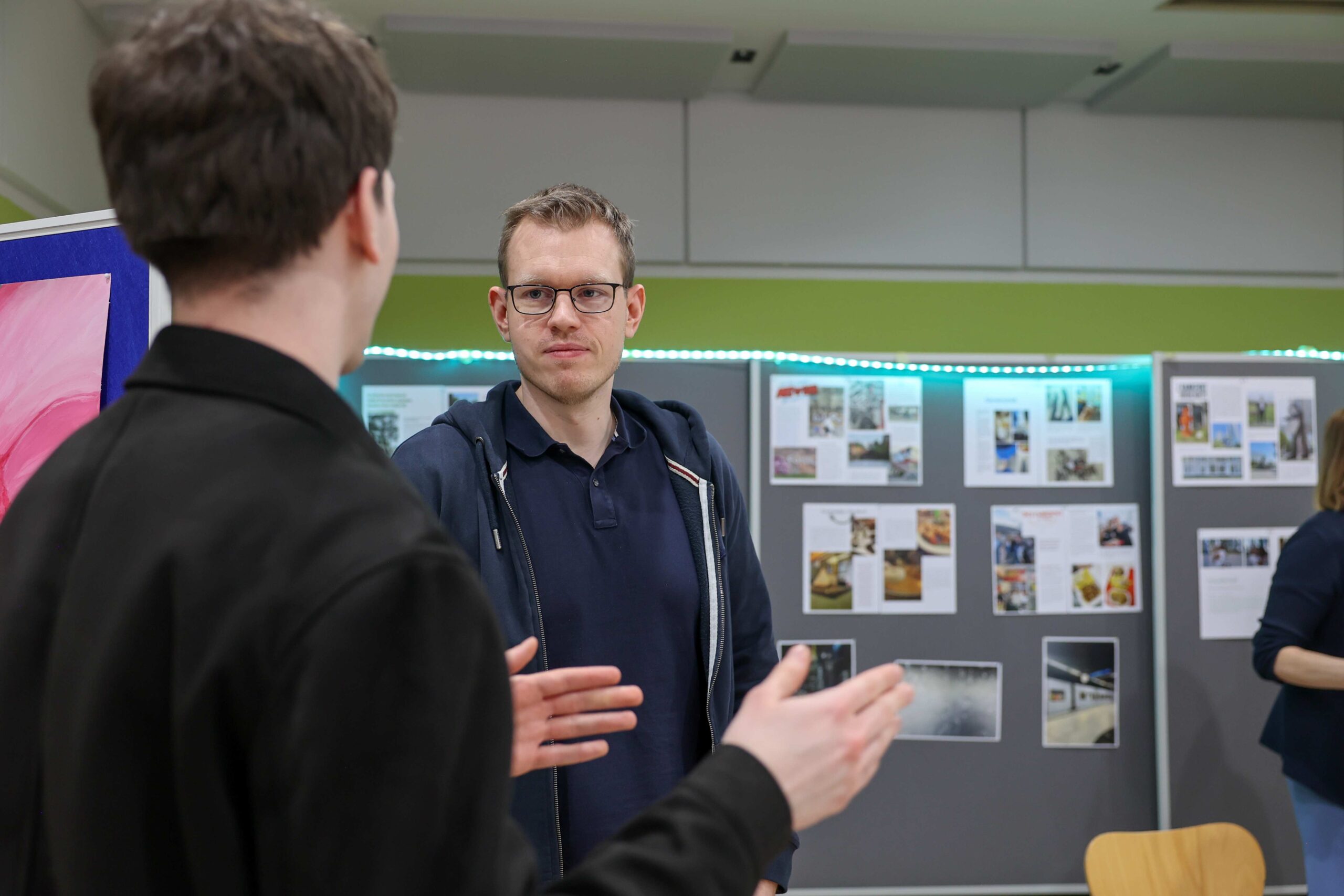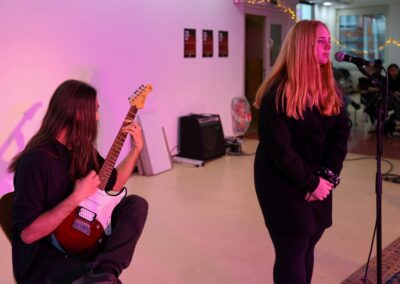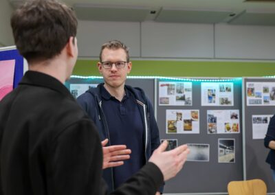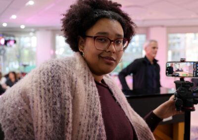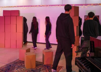 Eingerahmt wurde das Bühnenprogramm von beeindruckenden Kunstausstellungen im Foyer und in der Mensa. Die Kunst-Kurse von Silvia Adams und Carola Ströter präsentierten Werke wie „Der sinnliche Blick auf die Blüte“, „Come together into the new year 2026“ sowie das Projekt „HeimaRt“ aus dem Jahr 2025. Eine großformatige Videoinstallation per Beamer setzte die Bilder aus dem Kunstkurs von Carola Ströter zusätzlich großformatig in Szene. Ein herzlicher Dank geht hierbei auch an Martin Oyntzen (13c) und Olivia Krajewska (13d) für die inhaltliche Begleitung der Ausstellung.