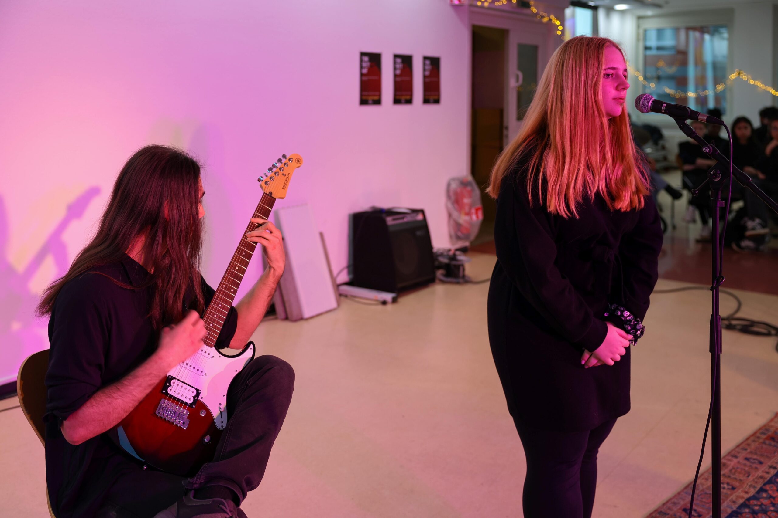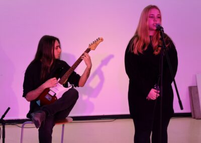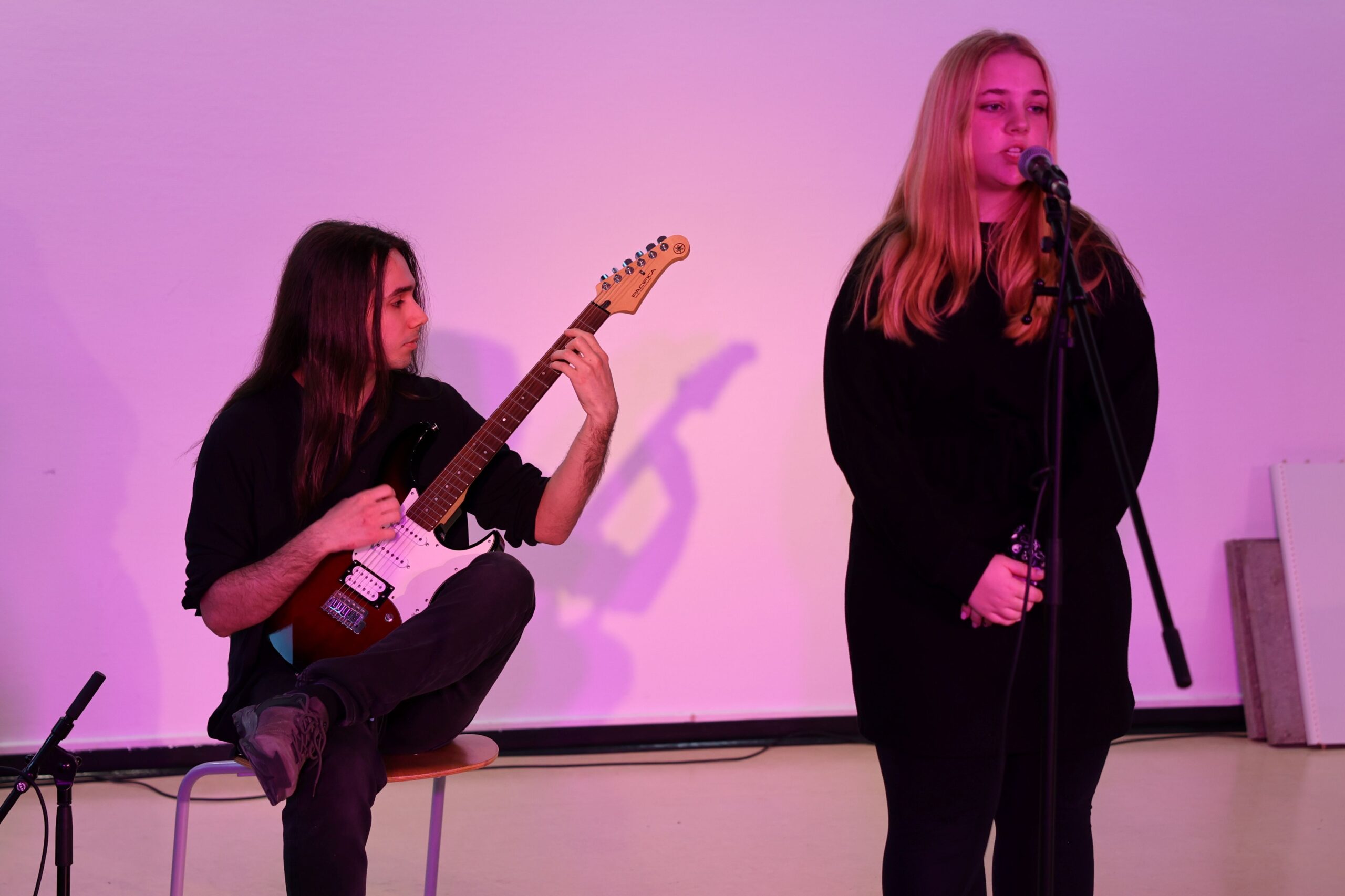 Ein besonderer Applaus galt dem Duo Anastasia Schiebelbein (11e) und Mücahid Aydin (13a). Die beiden, die aus der von Herrn Reichardt geleiteten Schulband hervorgegangen sind, begeisterten das Publikum mit ihrer Version von „Duvet“ (Bôa).